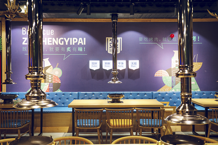 品深餐饮设计团队通过这几个方面的用心付出,通过品牌形象设计及主色调将品牌名及现拌烤肉,新鲜入味的核心特点传达出来,再通过空间立体化中各种装饰、家具、灯光、配饰、墙面主题文案等。形成了从虚的文化到实的场景,将难于描述清晰的品牌内涵处处展现在空间装饰,品牌物料,广告宣传中,以一种润物细无声的方式将炙成一派的品牌内涵、产品卖点植入到顾客心智中,形成鲜明的品牌印象,成为消费口口相传的海口首家现拌炙子烤肉店,每晚营业到凌晨4点,排队严重,月均营业额突出百万,实现优良的经济效益。