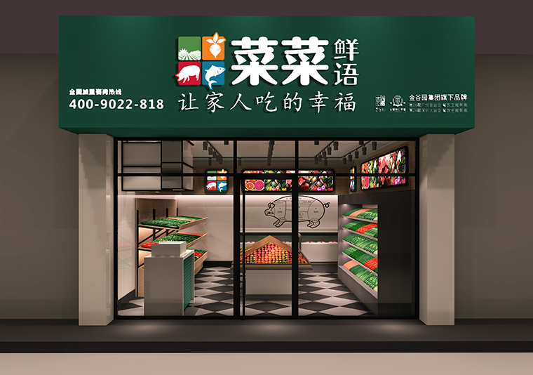 社区生鲜连锁店装饰装修设计、生鲜连锁店形象设计、生鲜连锁店软装灯光设计。