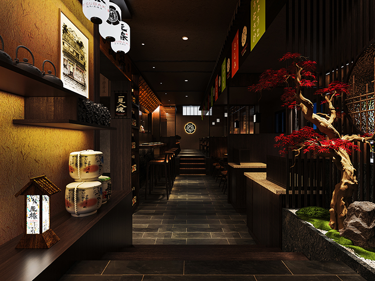 我们从门头开始到天花吊顶、地面铺设、墙面涂料、灯光、家具等各方面围绕“京都味道、匠传玉椿”来展开步移景异,一步一景的空间效果图设计。